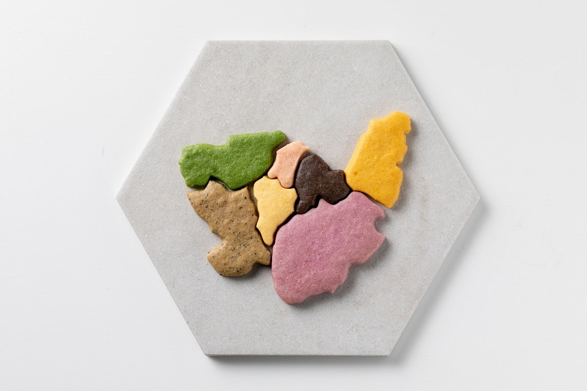 カラフルな見た目は、北九州市の多様性を表しています。野菜や果物のパウダーで色付けしていますのでどの区がどの味なのか、当ててみてください。